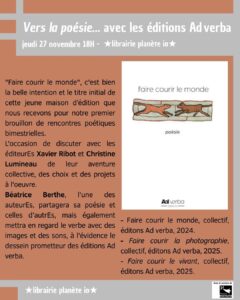 Pour cette troisième publication, les éditions Ad verba ont proposé des œuvres d’artistes ayant des démarches liées au vivant. 44 poèmes ont été retenus par le comité de lecture, sur les 469 textes reçus, pour irriguer la diversité que notre futur réclame.  Animal, humain et végétal, trois mondes et une seule Terre…